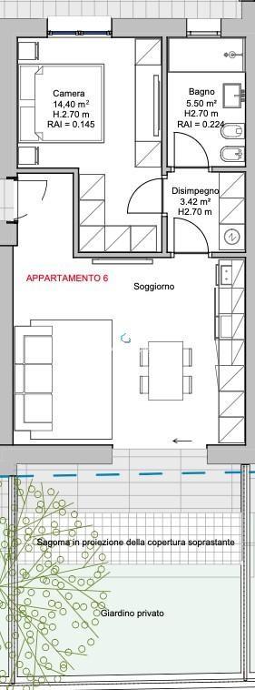L´ appartamento proposto è un Bilocale con loggia e giardino privato. L´appartamento è composto da soggiorno con cucina a vista, disimpegno, bagno, camera matrimoniale. La zona giorno si completa con una loggia di 6,05 mq. Possibilità di scegliere un garage singolo o doppio ad un prezzo extra.