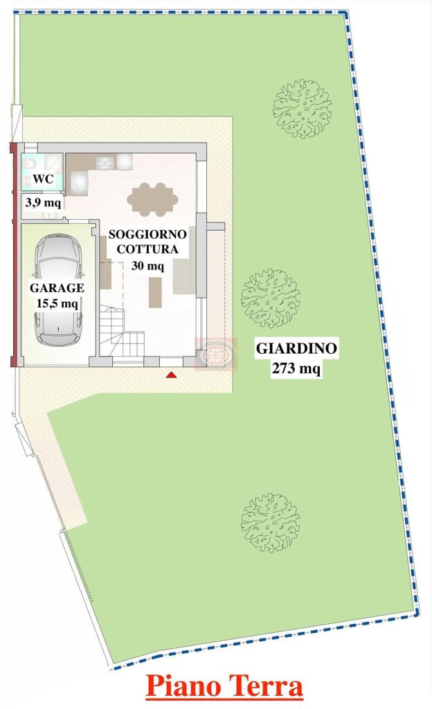 La villetta è disposta su due livelli così suddivisi: PIANO TERRA ingresso su soggiorno con angolo cottura (mq 29,50), antibagno-bagno, ampio giardino privato di mq 273 garage e posto auto; PIANO PRIMO disimpegno, tre camere da letto, due bagni, due balconi.